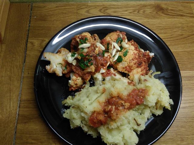 V době, kdy se květák peče, si na suché pánvi opražíte ty mandličky a nasekáte petrželku. A taky si uvařila pořílohu třeba obyč bramobry, a nebo toho využijete k výrobě lepčí přílohy v podobě výborných šťouchaných brambor. Ty nejdříve uvaříte a pak na pánvičce po mandlích opečete cibulku, brambory rozšťoucháte a smícháte s tou cibuličkou.