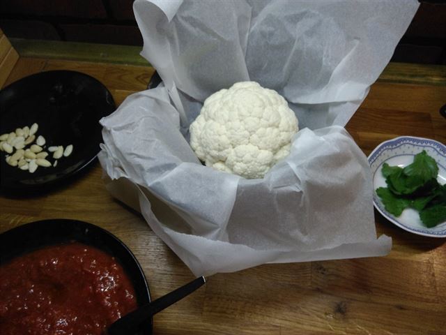 aby se panu květákovi dobře hajalo. (Ale moc nevím, proč tam má být??? V receptu o tomto kroku není ani zmínka, ale pak na fotkách vidíte květák trůnit v papíru, kterej se navíc ale rozmočí, takže vyndat mi to v něm teda nešlo.), takže příště asi podestýlku vynechám. Ne asi, určitě.